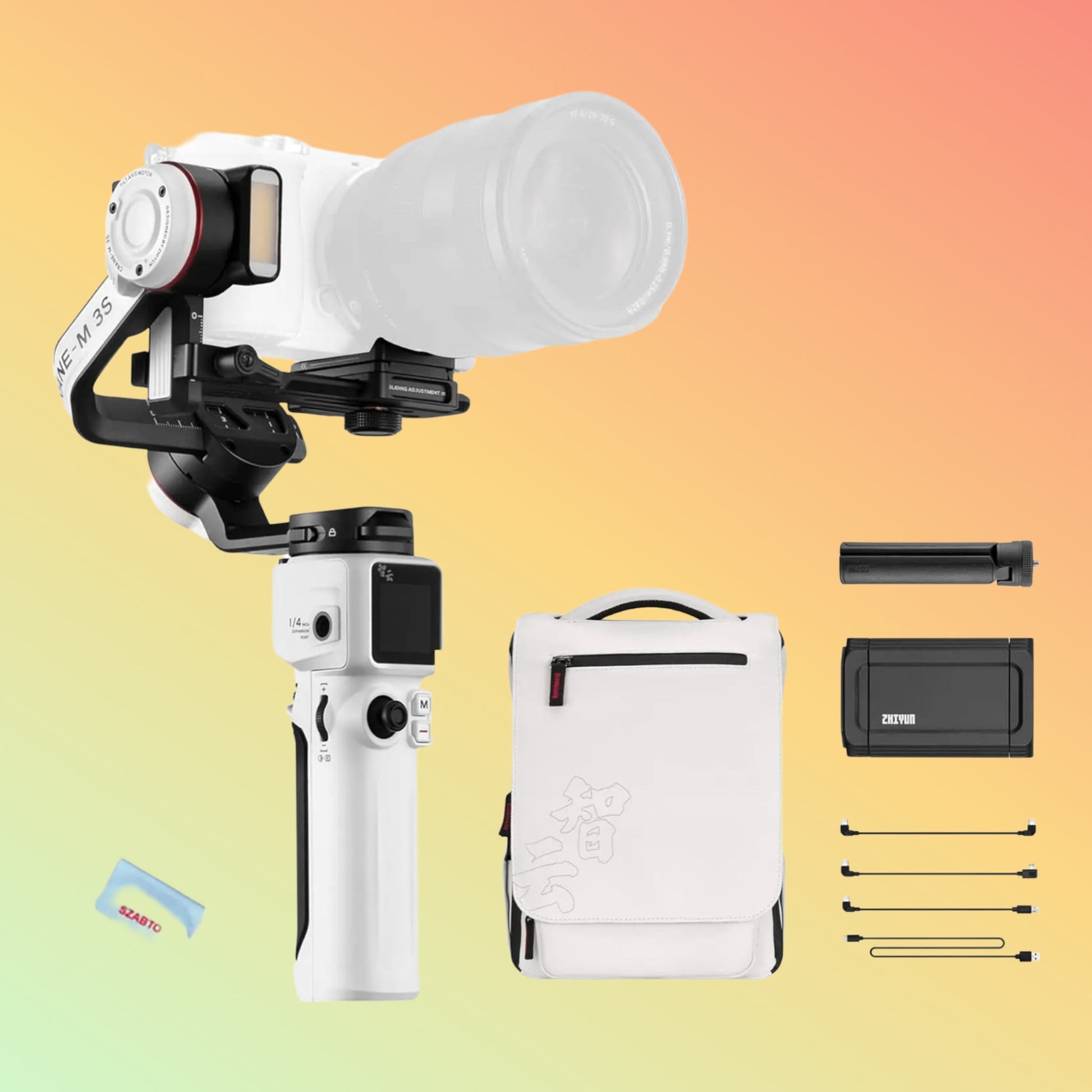 Comes complete with the Zhiyun CRANE-M3S gimbal, carrying case, charging cables, and user manual. All components are securely packaged to prevent damage during shipping.